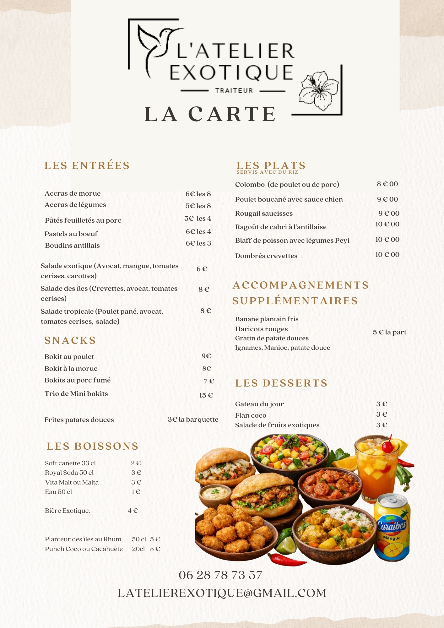 Ce qui nous distingue et fait la spécificité de L'Atelier Exotique, c'est l'originalité et la richesse de nos plats du monde, tous gorgés de soleil et inspirés de nos origines antillaises. Loin des propositions classiques, L'Atelier Exotique vous offre une explosion de saveurs uniques et faites maison, pour un véritable voyage culinaire qui ravira vos papilles.
